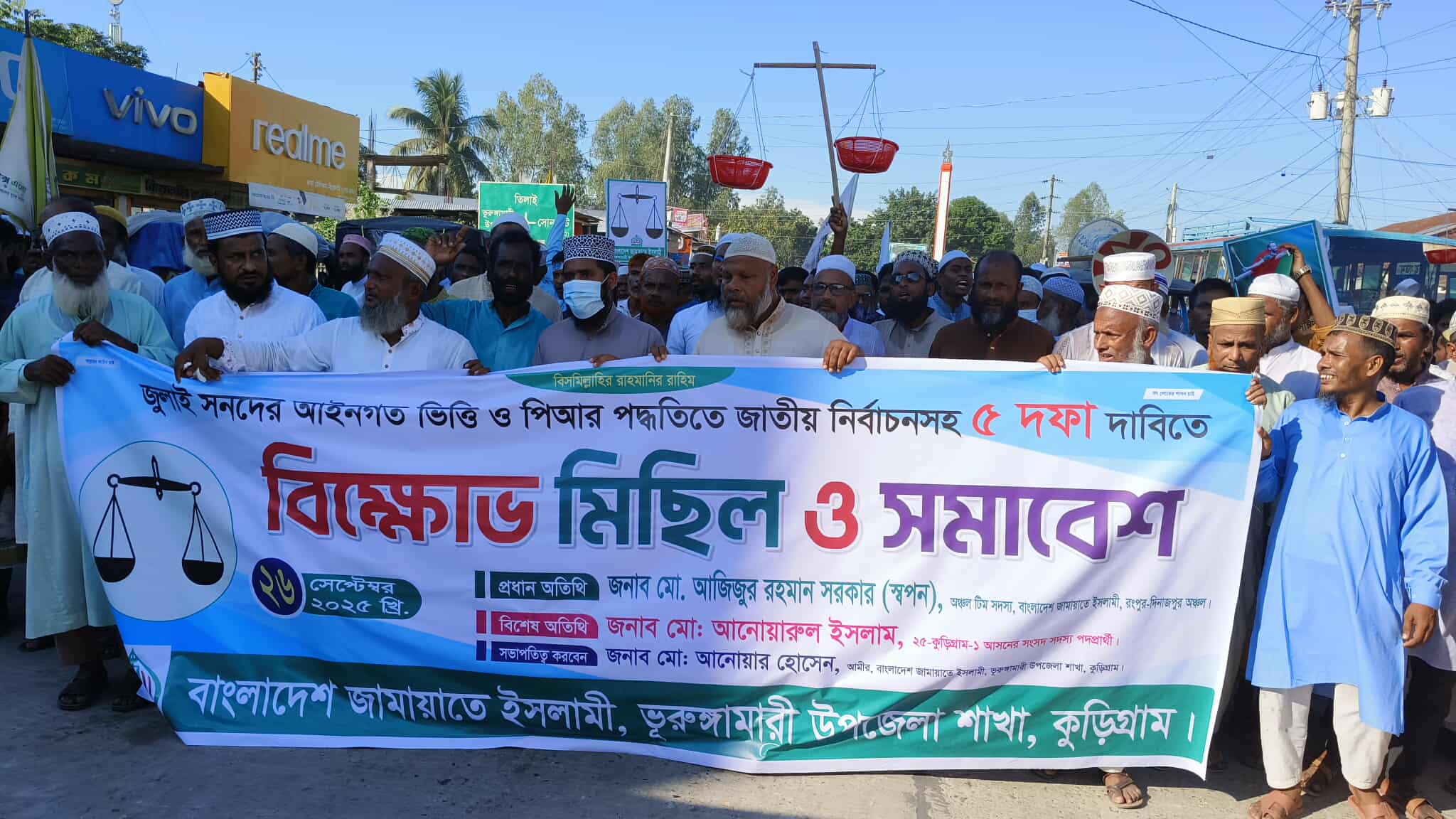 আগামী ফেব্রুয়ারিতে জুলাই সনদের ভিত্তিতে জাতীয় নির্বাচন অনুষ্ঠানসহ কেন্দ্র ঘোষিত ৫-দফা দাবিতে কুড়িগ্রামের ভূরুঙ্গামারীতে বিক্ষোভ মিছিল করেছে বাংলাদেশ জামায়াতে ইসলামী।