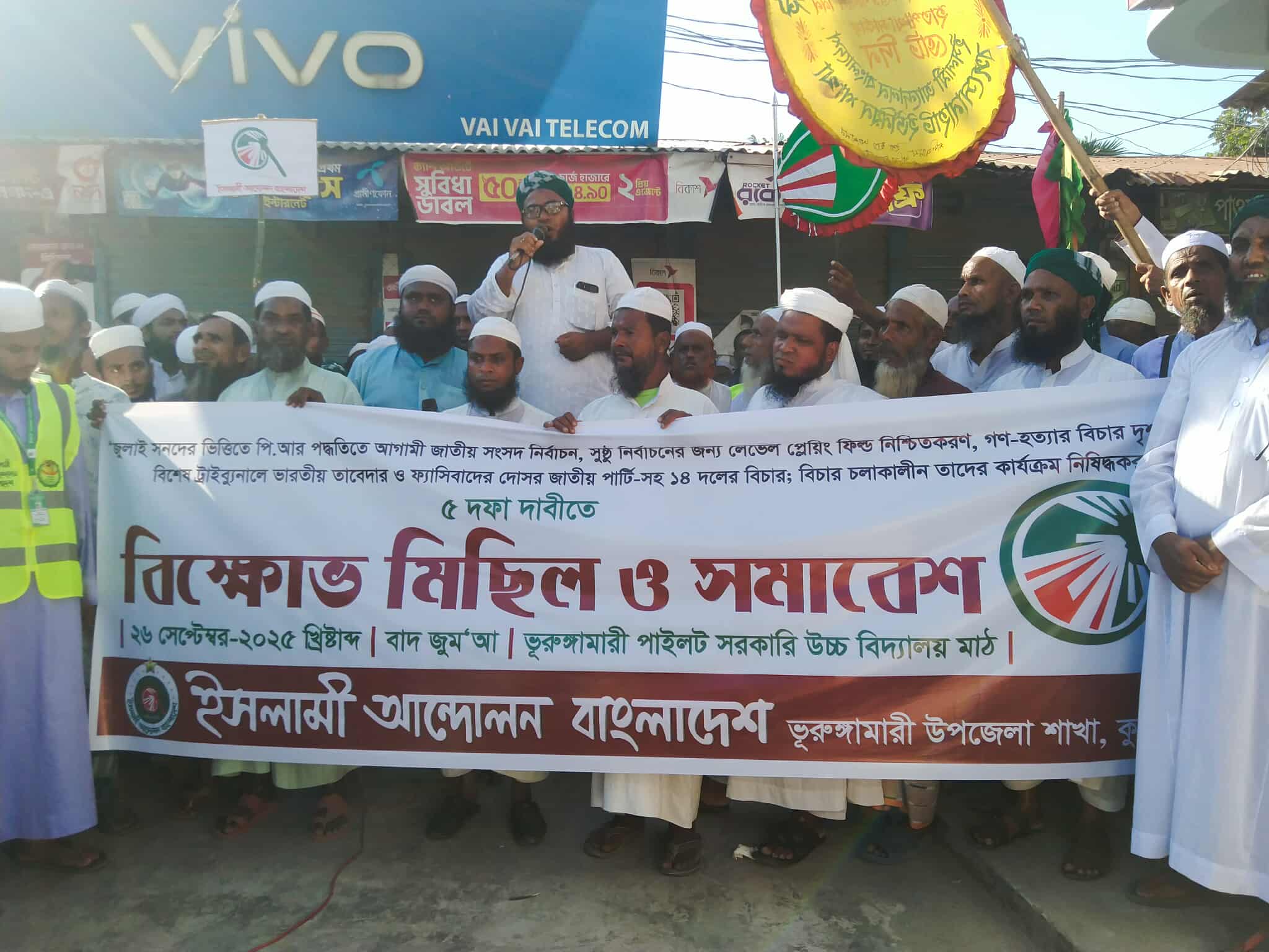 মিছিলটি উপজেলার প্রধান প্রধান সড়ক প্রশিক্ষণ করে সরকারি ডিগ্রী কলেজ মোড় ইসলামী ব্যাংকের সামনে জড়ো হয়ে সমাবেশ করেন। বিক্ষোভ মিছিলে নেতৃত্ব দেন ইসলামী আন্দোলন বাংলাদেশ মনোনীত ২৫ কুড়িগ্রাম ১ আসনের এমপি পদপ্রার্থী জননেতা হারিসুল বারি রনি রনি। এসময় ইসলামী আন্দোলন বাংলাদেশ উপজেলার এসিস্ট্যান্ট সেক্রেটারি এইচ এম নুরুন্নবী হোসাইন এর সঞ্চালনায় বক্তব্য রাখেন ইসলামী আন্দোলন বাংলাদেশ উপজেলার শাখার সভাপতি মুফতী ওমর ফারুক ফারুকী সাহেব, সহ-সভাপতি জুলহাস উদ্দিন (BSC), সেক্রেটারি মুফতি এসএম মনিরুজ্জামান, মুজাহিদ কমিটির উপজেলার সদর হারুনুর রশিদ, ইসলামী যুব আন্দোলন বাংলাদেশ, ভূরুঙ্গামারী উপজেলা শাখার সভাপতি মাওলানা মোসলেম উদ্দিন প্রমুখ।