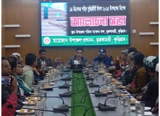 কুড়িগ্রাম জেলার ভূরুঙ্গামারী উপজেলায় যথাযোগ্য মর্যাদা ও ভাবগাম্ভীর্যের মধ্য দিয়ে শহীদ বুদ্ধিজীবী দিবস উপলক্ষে আলোচনা সভা অনুষ্ঠিত হয়েছে। রবিবার (১৪ ডিসেম্বর) সকালে উপজেলা পরিষদ সম্মেলন কক্ষে উপজেলা প্রশাসনের আয়োজনে এ আলোচনা সভা অনুষ্ঠিত হয়।
