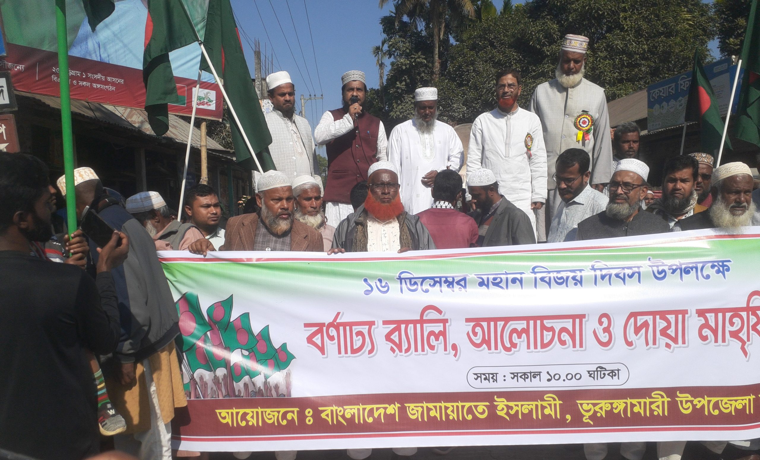 কুড়িগ্রামের ভূরুঙ্গামারীতে মহান বিজয় দিবস উপলক্ষ্যে বিজয় র্যালি করেছে উপজেলা জামায়াতে ইসলামী। মঙ্গলবার ( ১৬ ডিসেম্বর ) সকাল সাড়ে ১০ টায় উপজেলার কেন্দ্রীয় বাস টার্মিনাল থেকে বিজয় র্যালি শুরু হয়। যা উপজেলার গুরুত্বপূর্ণ সড়ক ঘুরে হাসপাতাল রোডের সাদ্দাম মোড়ে এসে শেষ হয়। হাতে জাতীয় পতাকা ও বিভিন্ন রকমের ব্যানার ফ্যাস্টুন নিয়ে বিপুল সংখ্যক নেতা কর্মী বিজয় র্যালিতে অংশ গ্রহণ করে।