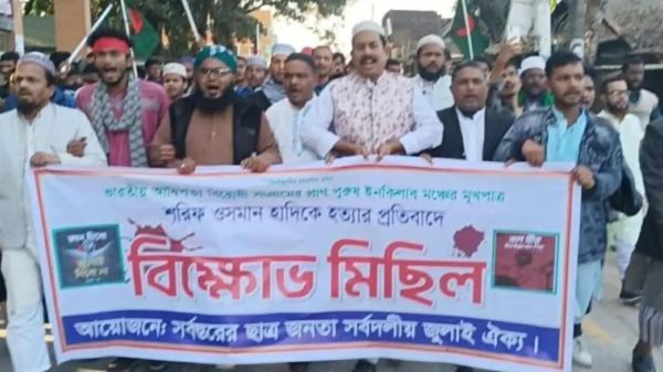 ভূরুঙ্গামারীতে হাদির হত্যাকারীদের গ্রেপ্তার করে ফাঁসির দাবিতে বিক্ষোভ। মোহাম্মদ কামরুল হাসান কাজল, কুড়িগ্রাম জেলা প্রতিনিধিঃ কুড়িগ্রামের ভূরুঙ্গামারীতে ইনকিলাব মঞ্চের মুখপাত্র শরিফ ওসমান হাদির হত্যাকারীদের দ্রুত গ্রেপ্তার করে ফাঁসির দাবিতে