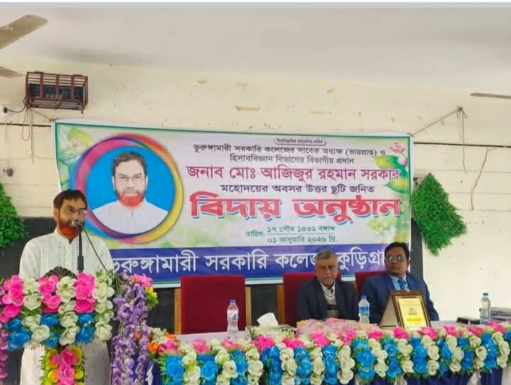 ভূরুঙ্গামারী সরকারি কলেজের সাবেক ভারপ্রাপ্ত অধ্যক্ষ মো. আজিজুর রহমান সরকার (স্বপন) দীর্ঘ ৩১ বছরের শিক্ষকতা জীবন শেষে অবসরজনিত ছুটিতে গেছেন। এ উপলক্ষে কলেজ প্রাঙ্গণে এক আবেগঘন বিদায় অনুষ্ঠানের আয়োজন করা হয়।