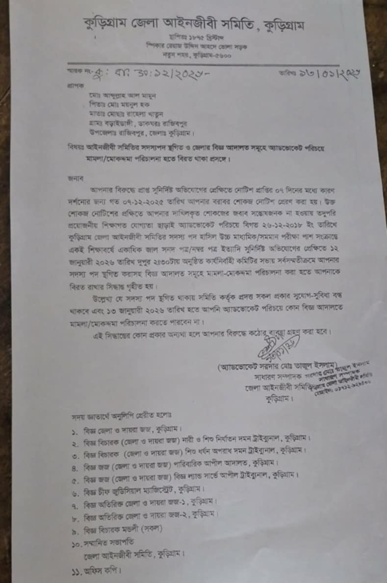 পত্রে আরো উল্লেখ করা হয় শোকজ নোটিশের প্রক্ষিতে আপনার দাখিলকৃত শোকজের জবাব সন্তোষজনক না হওয়ায় তদুপরি প্রয়োজনীয় শিক্ষাগত যোগ্যতা ছাড়াই অ্যাডভোকেট পরিচয়ে বিগত ২৬-১২-২০১৮ ইং তারিখে কুড়িগ্রাম জেলা আইনজীবী সমিতির সদস্য পদ হাসিল উচ্চ মাধ্যমিক/সমমান পরীক্ষা পাশ সংক্রান্ধে একই শিক্ষাবর্ষে একাধিক জাল সনদ পত্র/নম্বর পত্র ইত্যাদি সুনির্দিষ্ট অভিযোগের প্রেক্ষিতে ১২ জানুয়ারী ২০২৬ তারিখ দুপুর ২:৩০টায় অনুষ্ঠিত কার্যনিবাহী কমিটির সভায় সর্বসম্মতীক্রমে আপনার সদস্য পদ স্থগিত করাসহ বিজ্ঞ আদালত সমূহে মামলা-মোকদ্দমা পরিচালনা করা হতে আপনাকে বিরত রাখার সিদ্ধান্ত গৃহীত হয়।